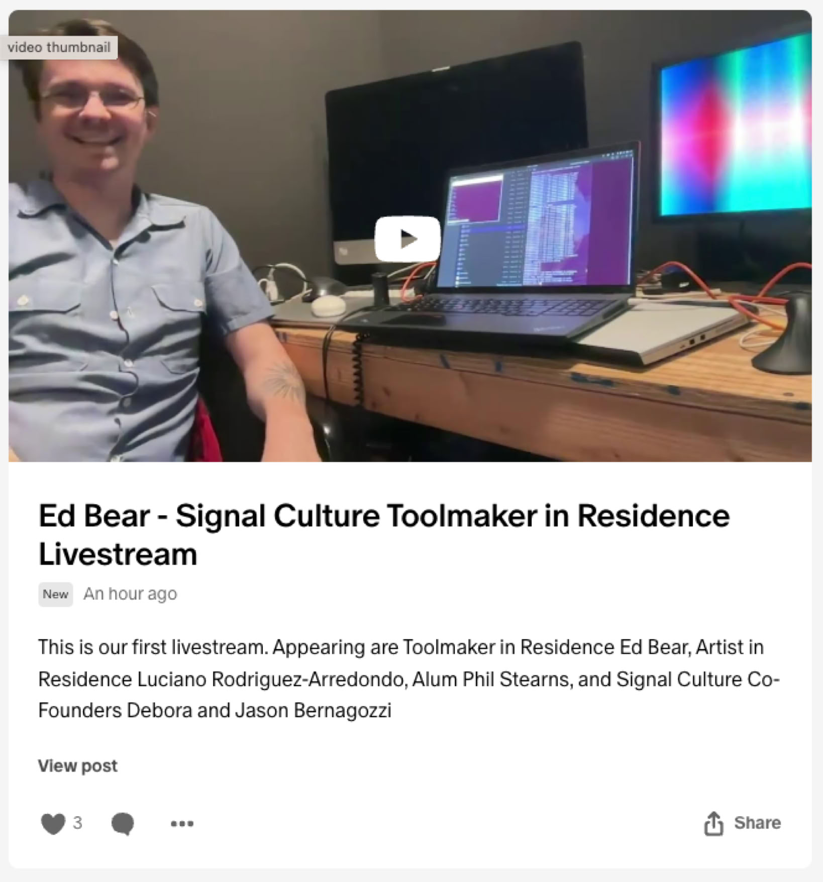 Signal Culture encourages creation of new work, building of community, and connection to history in the field of experimental media art by providing artists, researchers, and innovators with residencies, resources, and exhibition opportunities.